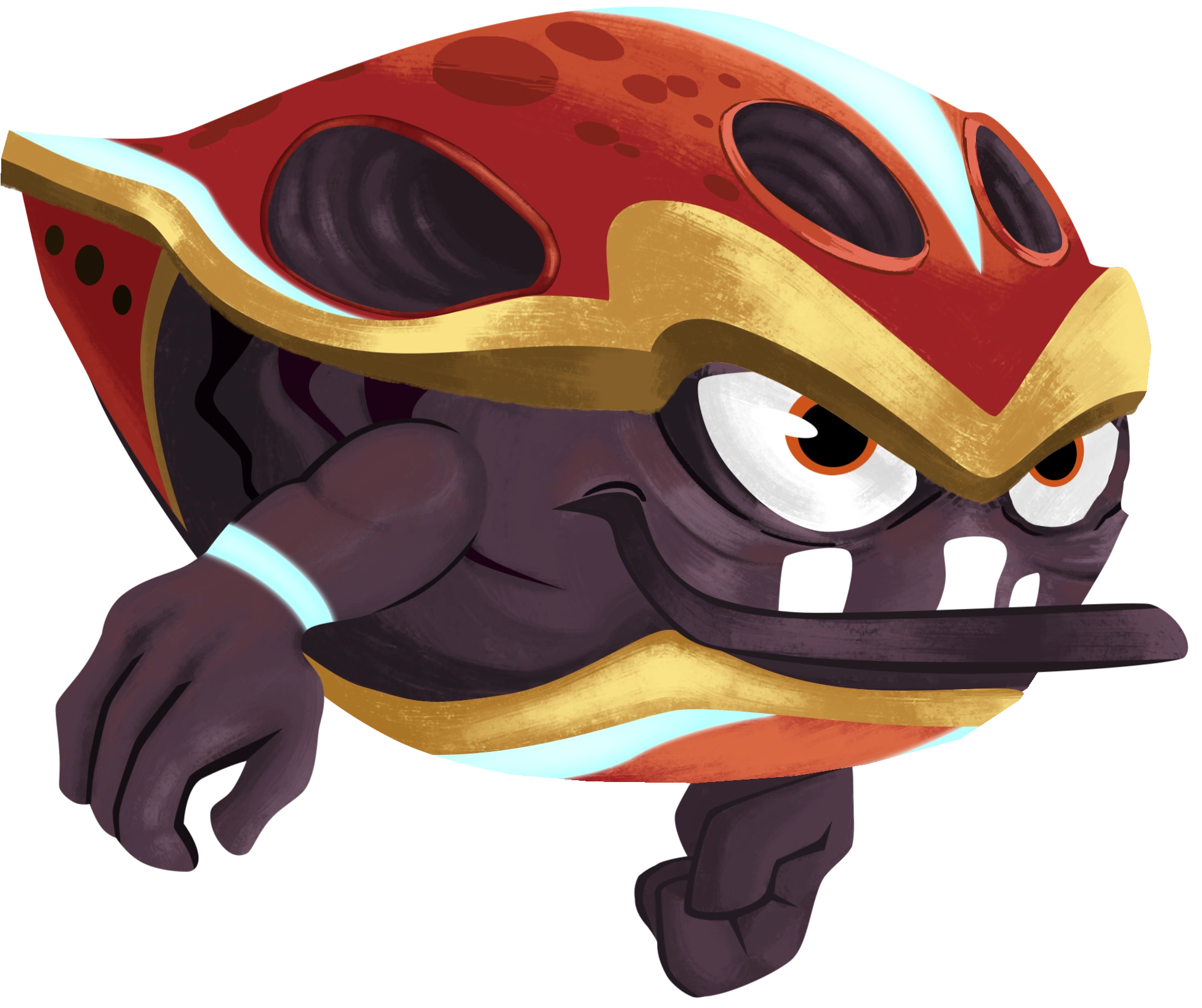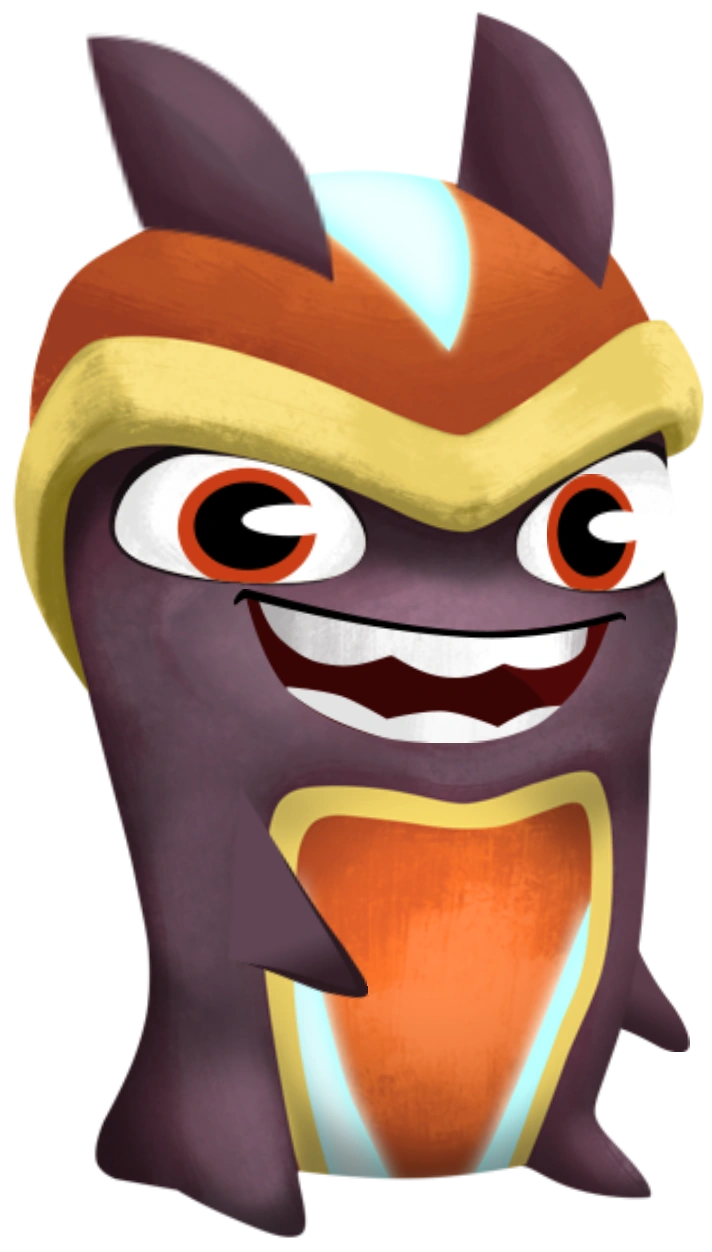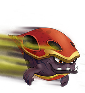 When transformed, they take on a shape that almost seems like a chestnut. While their colors stay the same, they form four large holes in their shell that emits different types of gasses (depending on the attack). The gasses tend to appear as different shades of brown and yellow (also depending on the attack). They have an underbite that shows uneven teeth.