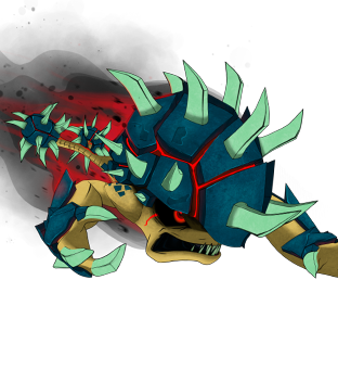 When transformed, their skin and armor keep the same colors. Their armor covers the back of their hands and tails. Their shells are covered in stout green spikes and their hands have green claws on each finger.