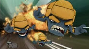 When transformed, they keep their yellow shell but their red spots disappear and their skin turns gray. The yellow parts of their body becomes fragmented armor. They gain this armor on their arms, hands, and tail. Their tail gets a round end. While they fly, sparks emit from them in a short trail.